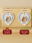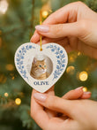 This heart-shaped cat ornament features your pet’s photo in a soft window surrounded by blue laurel sprigs. Your cat’s name sits beneath in clean type, letting the portrait stay center stage. It’s a sweet way to celebrate the kitty who rules your home, perfect for holiday trees and everyday display on a shelf. Crafted on a matte ceramic heart (approx. 3") so fur details and typography stay clear and soft.
