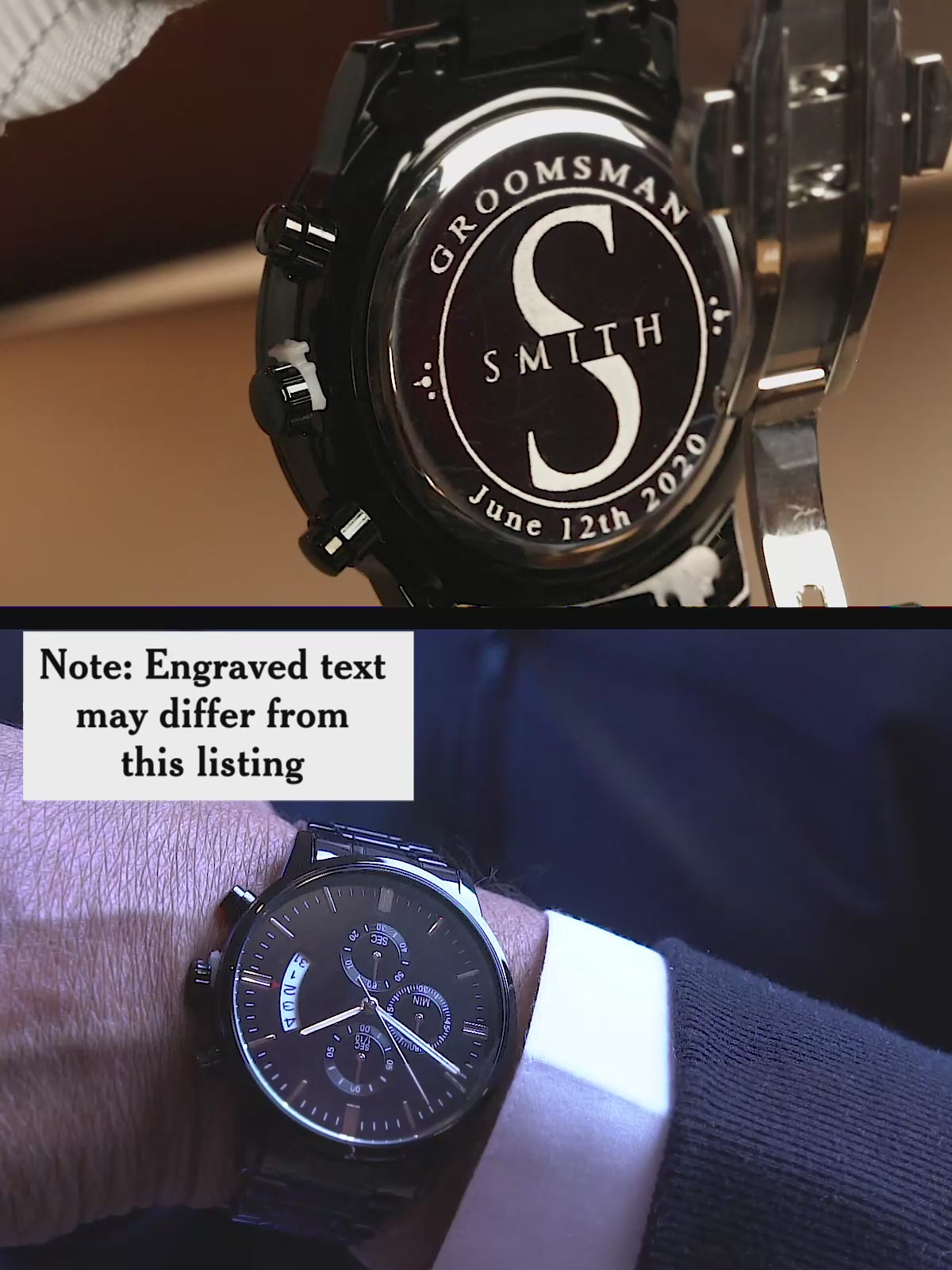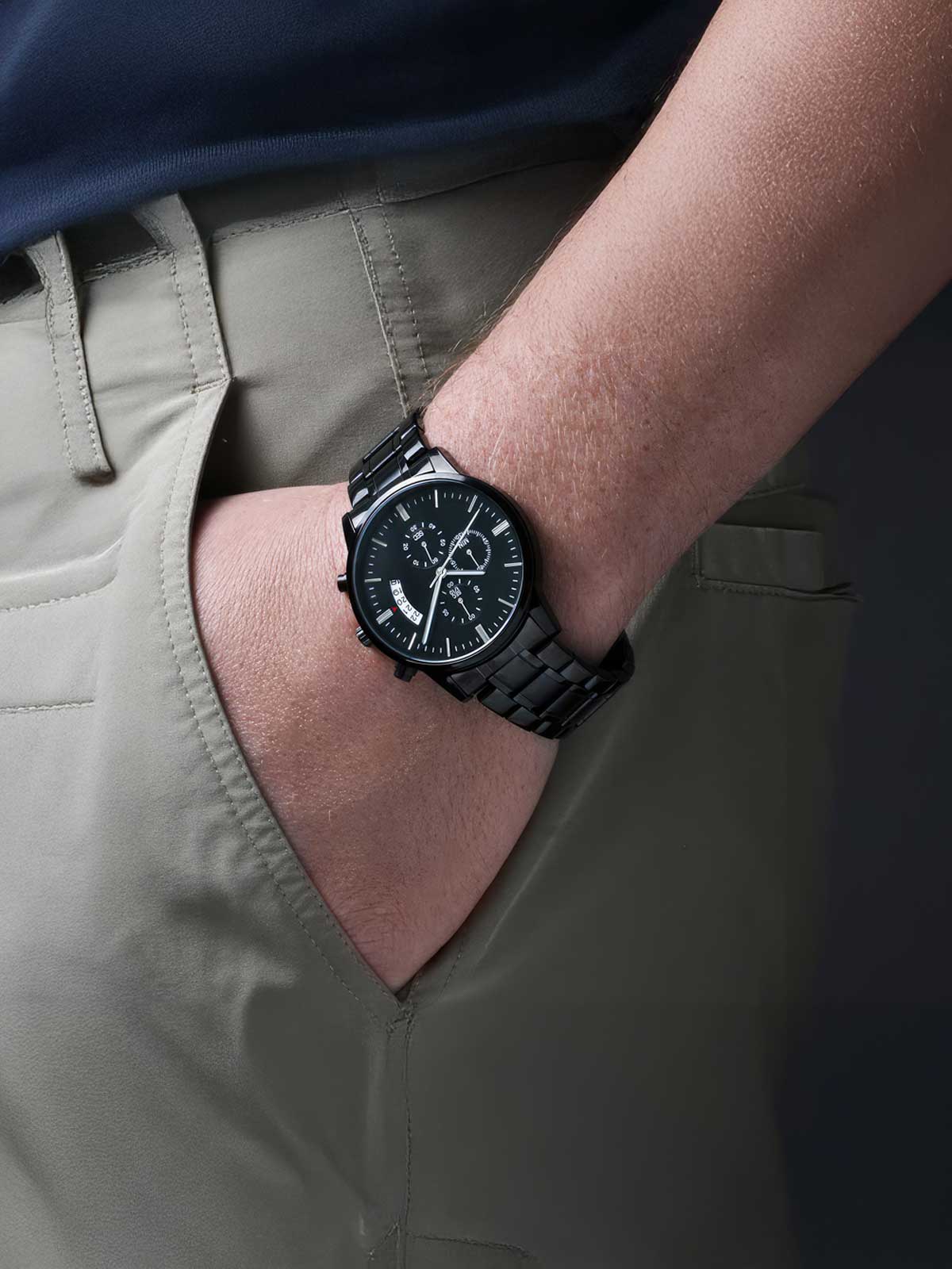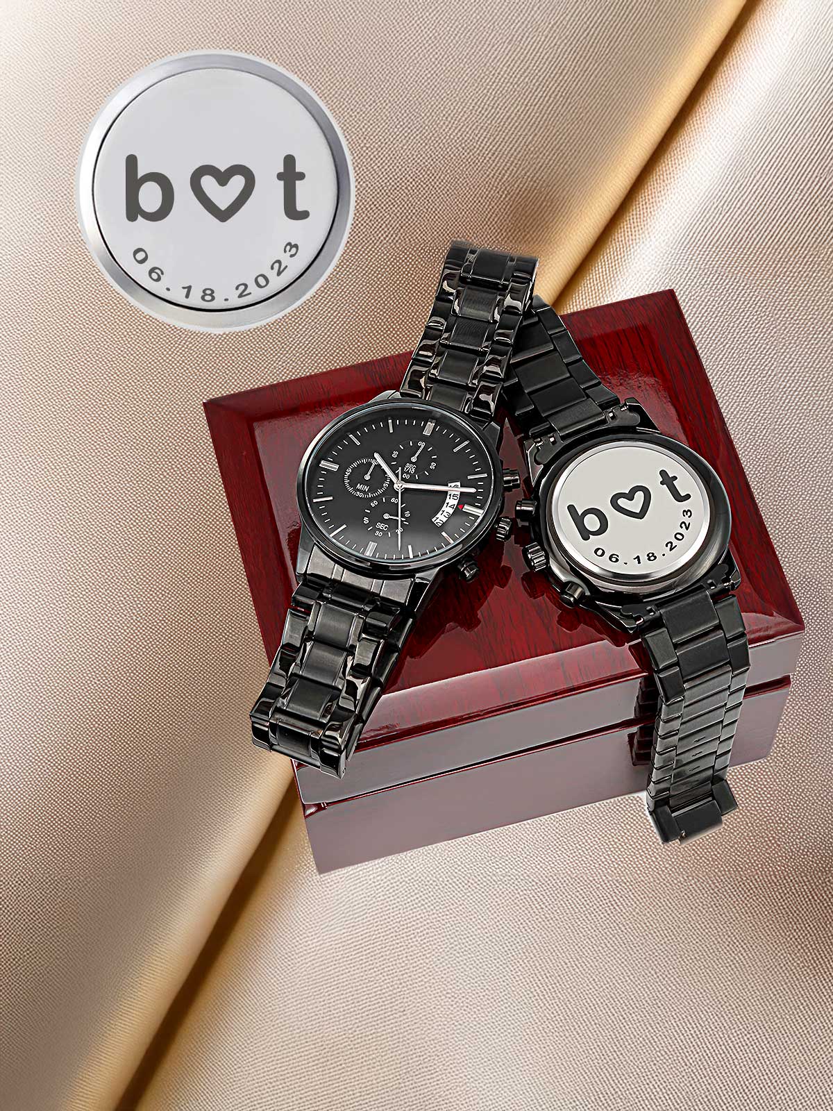 Celebrate your unique love story with this Chronograph Men's Watch, featuring couples' initials and a meaningful date engraved on the back. Whether it’s your engagement, wedding, or anniversary date, this watch transforms a timeless accessory into a deeply personal keepsake. Crafted with precision and style, it boasts a durable stainless steel case, a sleek chronograph design, and reliable quartz movement. Perfect for anniversaries, weddings, or as a heartfelt gift for your significant other, this watch symbolizes your shared journey and the moments that matter most.