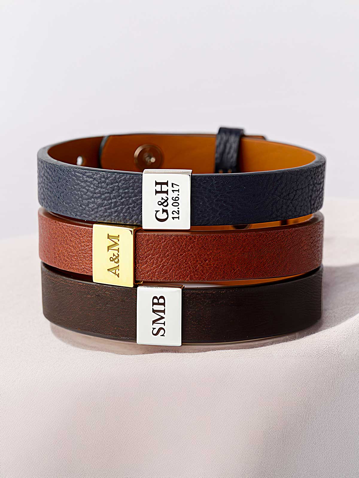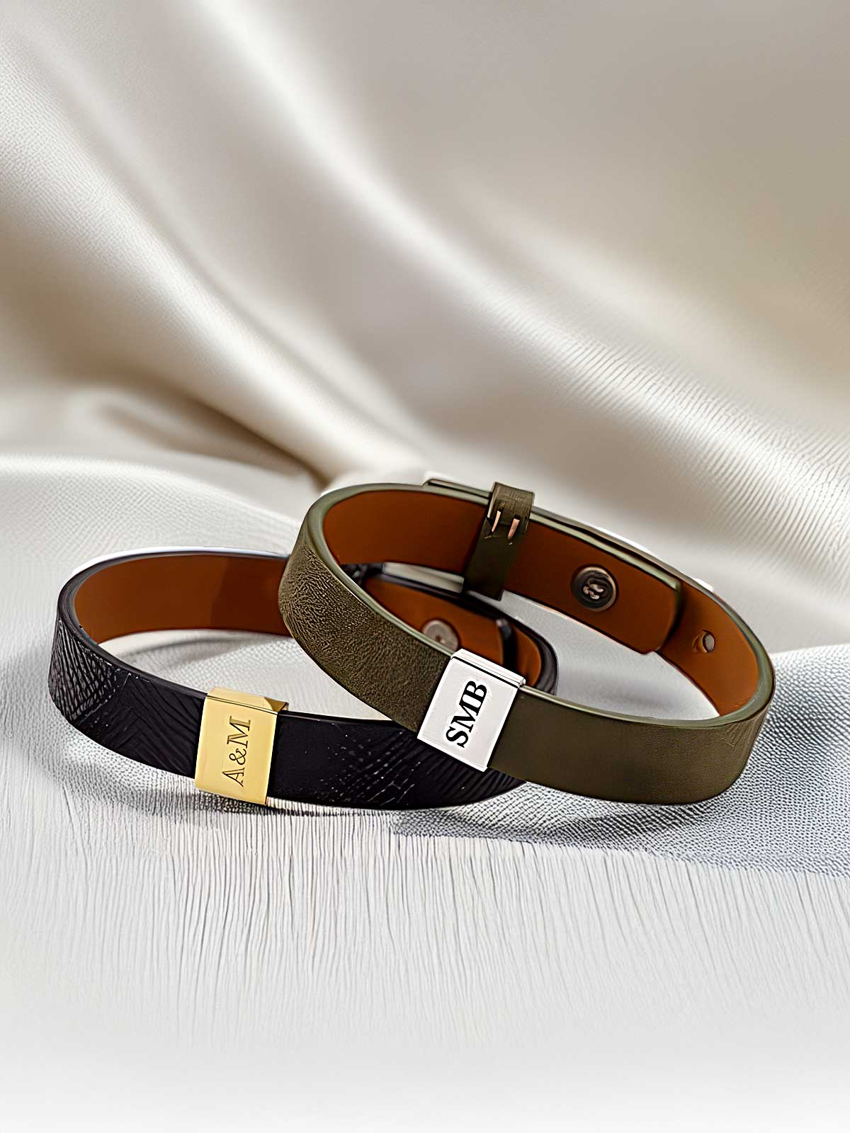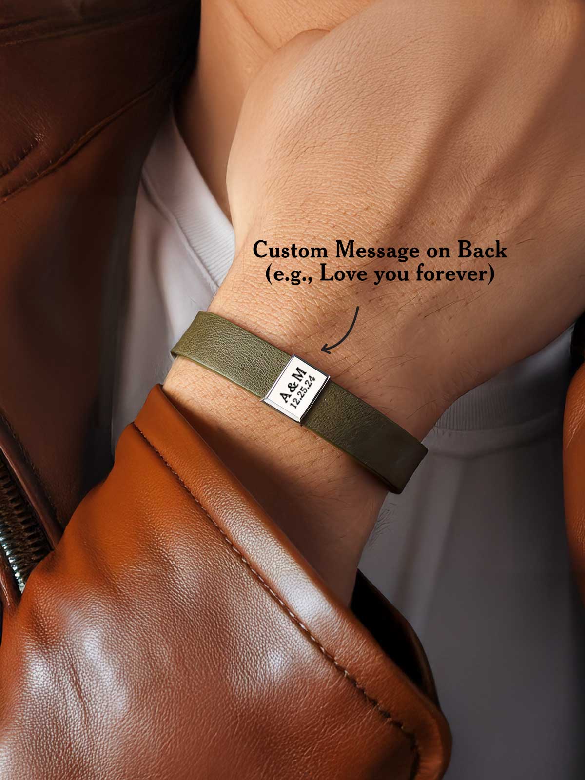 Celebrate your love story with our Couples' Initials & Date Men's Bracelet, a timeless keepsake for anniversaries, weddings, engagements, or any special occasion. Featuring your initials and a meaningful date engraved on the front, this bracelet is crafted with a genuine leather band for lasting style and comfort. Add a personal touch with a heartfelt message engraved on the back, making it a truly one-of-a-kind gift. Perfect for commemorating milestones and creating cherished memories.