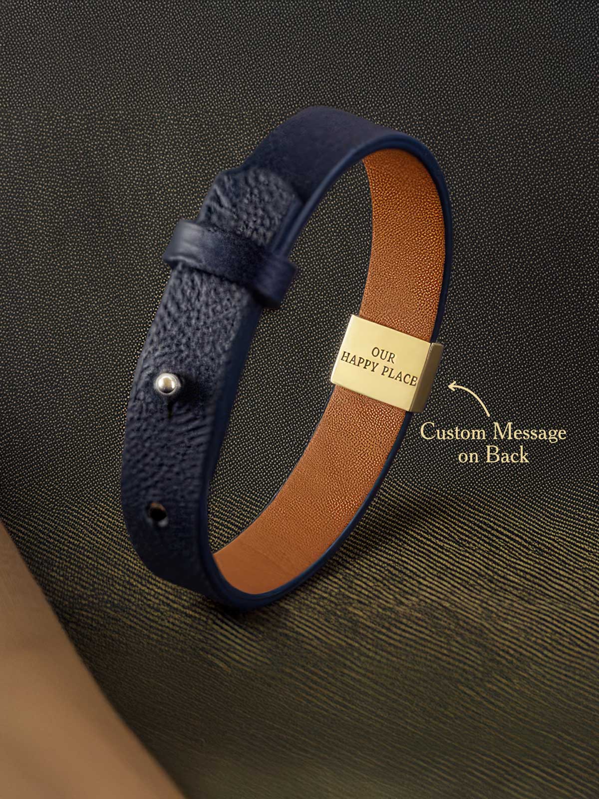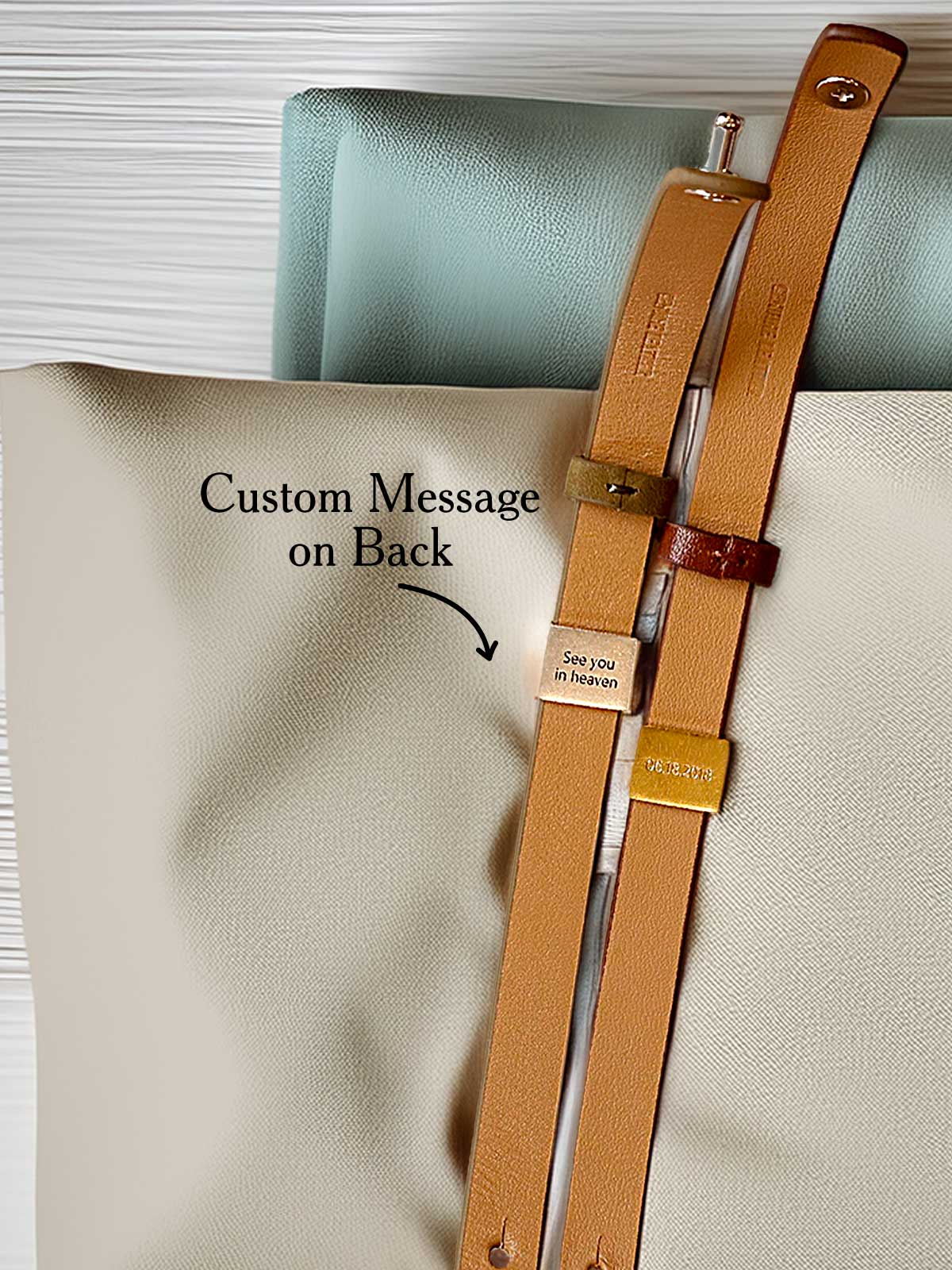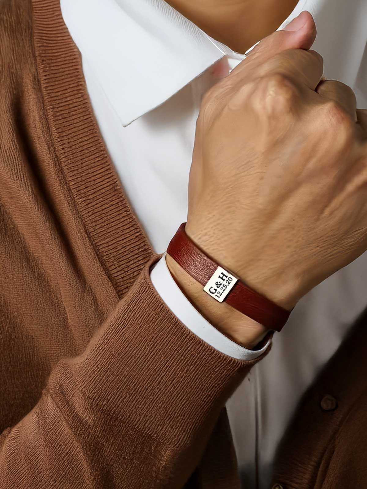 Celebrate your love story with our Couples' Initials & Date Men's Bracelet, a timeless keepsake for anniversaries, weddings, engagements, or any special occasion. Featuring your initials and a meaningful date engraved on the front, this bracelet is crafted with a genuine leather band for lasting style and comfort. Add a personal touch with a heartfelt message engraved on the back, making it a truly one-of-a-kind gift. Perfect for commemorating milestones and creating cherished memories.