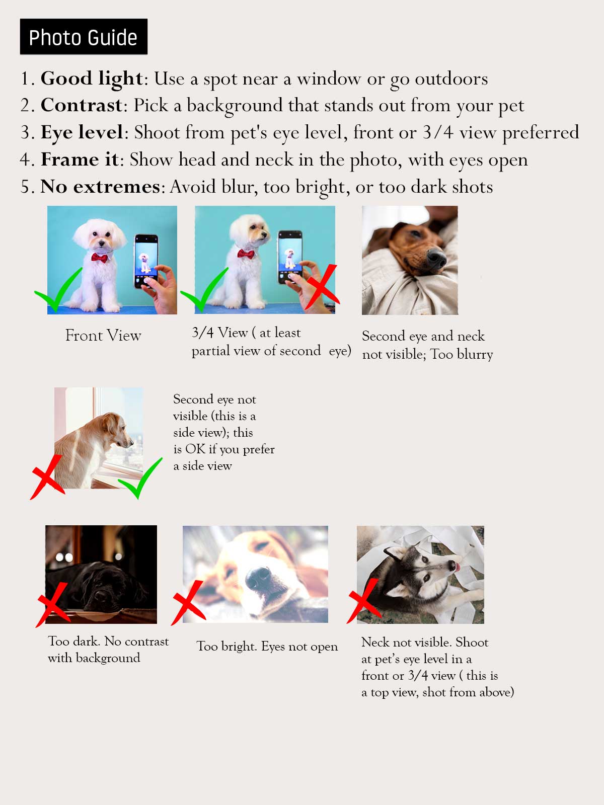 - Upload 2–3 clear photos of your pet (see Photo Guidelines in product images)