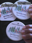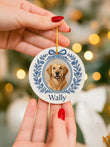 This Golden Retriever ornament showcases your dog’s happy face inside a blue toile-style laurel wreath and bow. The warm ivory background lets the golden fur glow, while the simple name line keeps the design clean. It’s a perfect gift for Golden lovers who want something a little more classic than a basic photo ornament. Printed on a matte ceramic circle (approx. 3") so brush textures and type stay soft and readable.