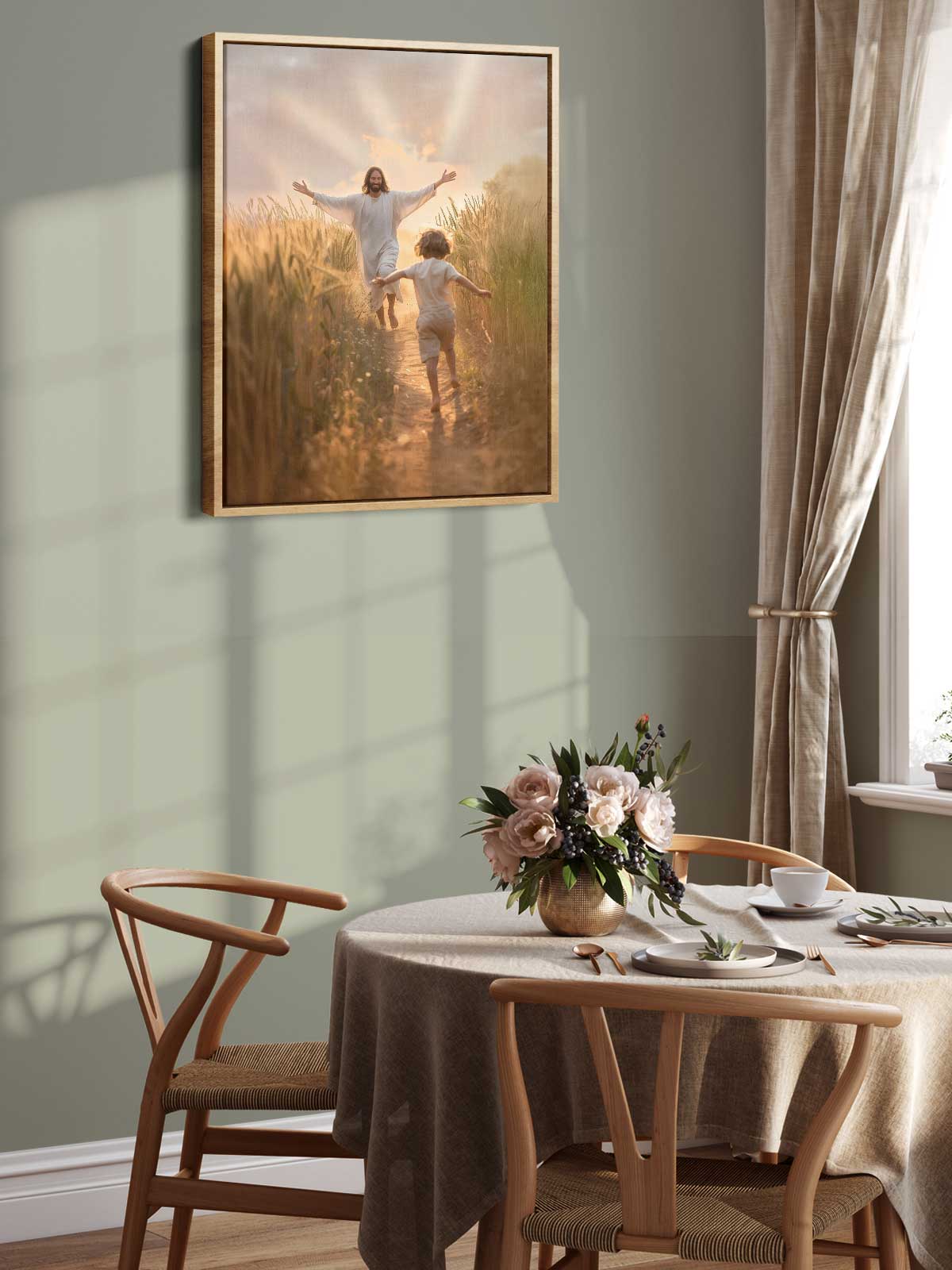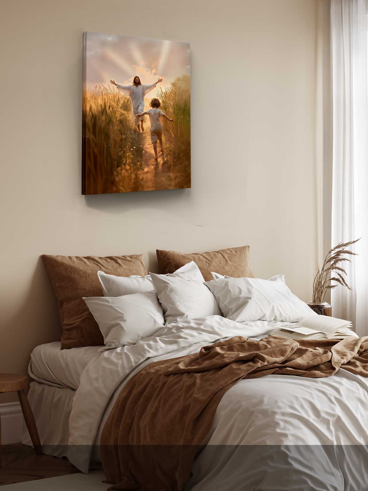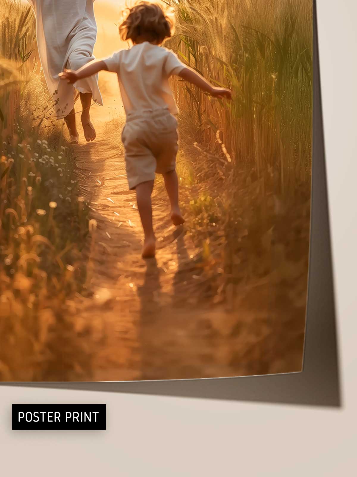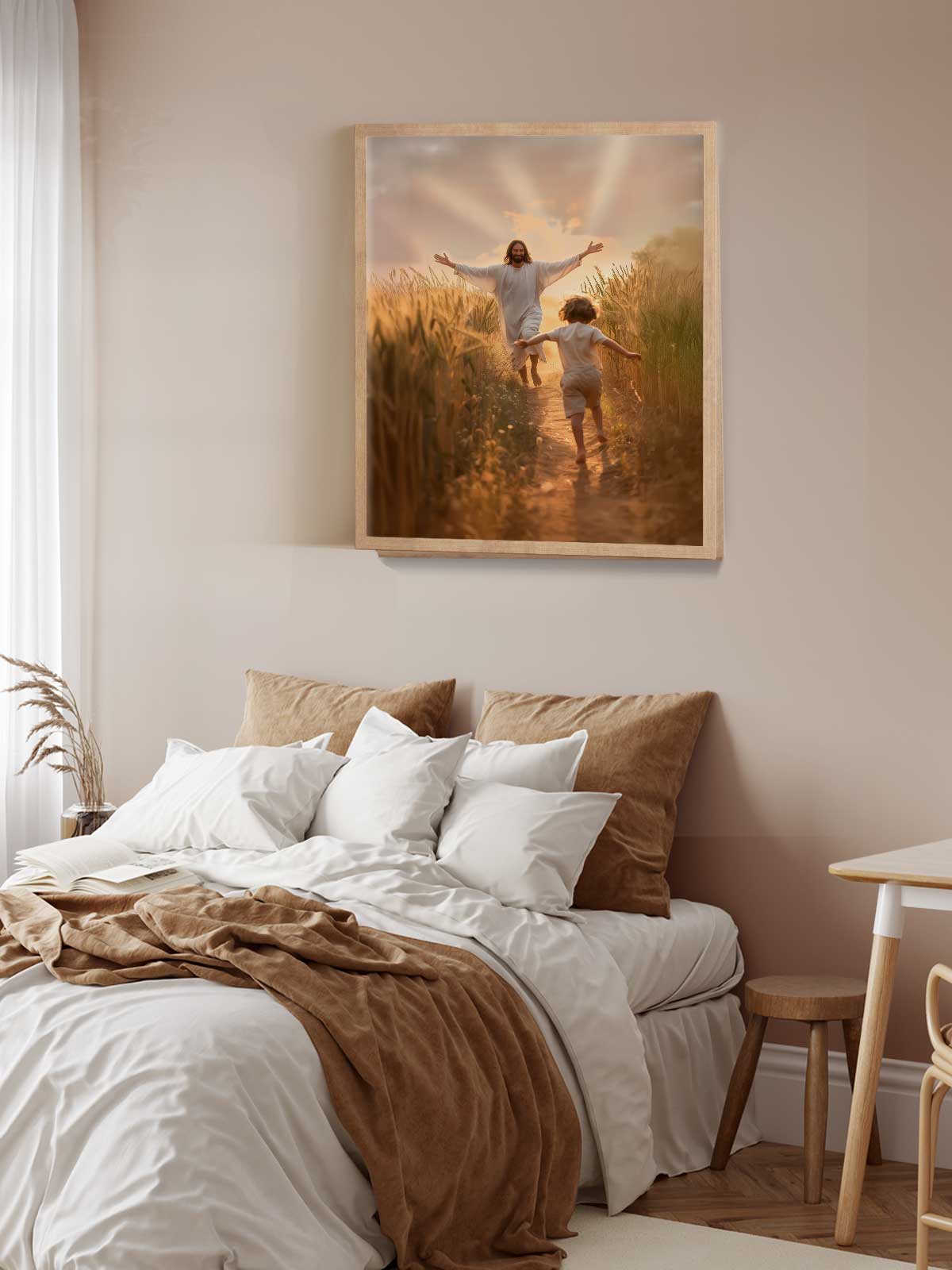 A joyful boy runs into the open arms of Jesus, his face beaming with delight. This artwork symbolizes the parable of the lost sheep and Christ’s promise to receive every soul with love. A hopeful reminder of restoration, it’s an uplifting gift for children, families, or anyone celebrating renewal in faith.