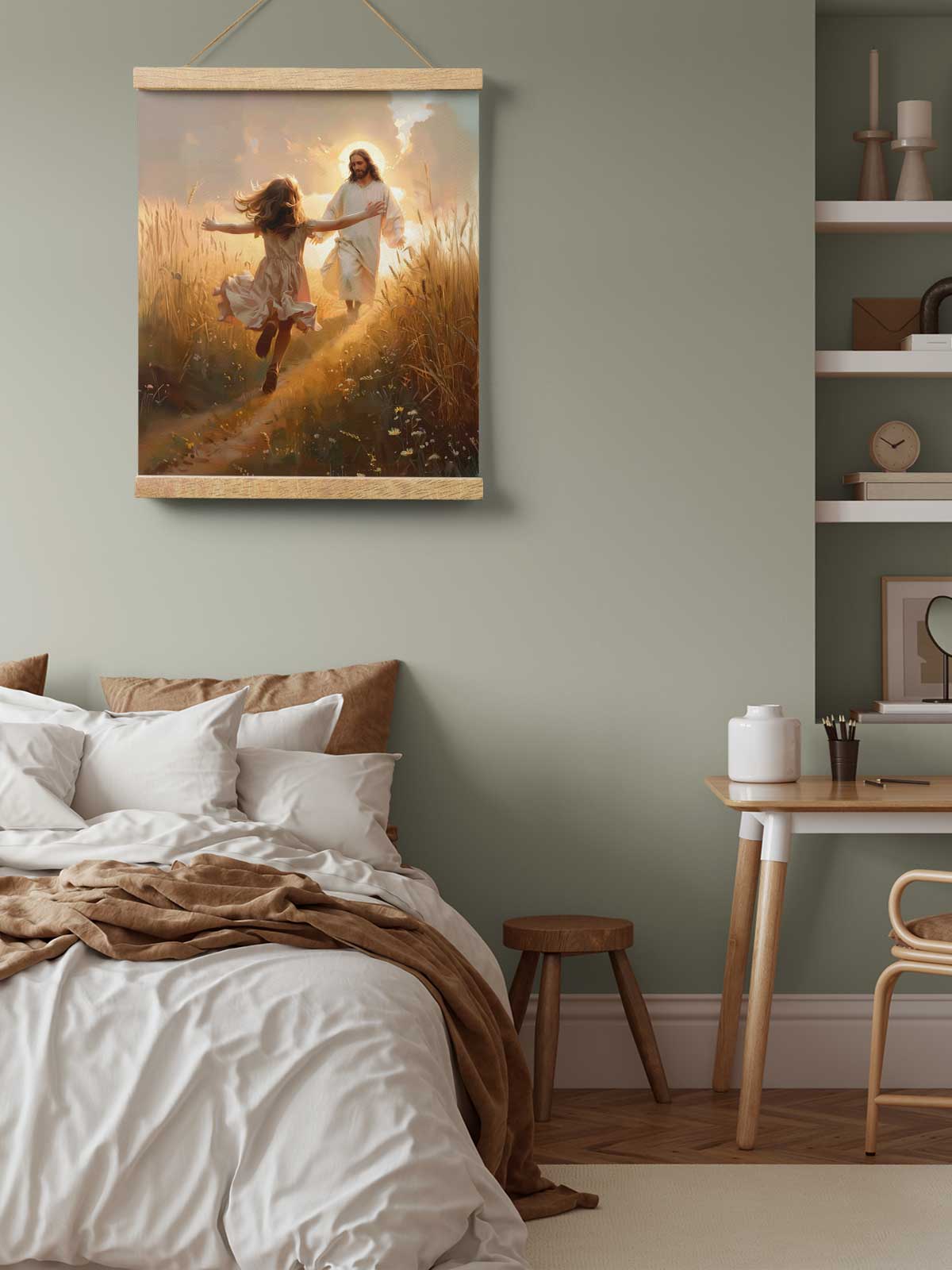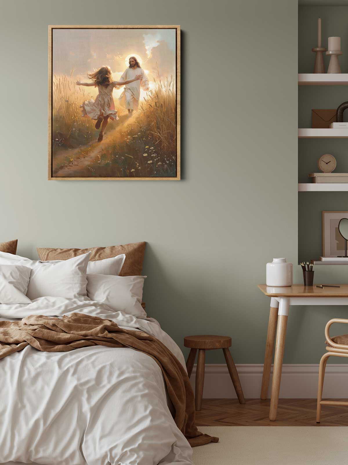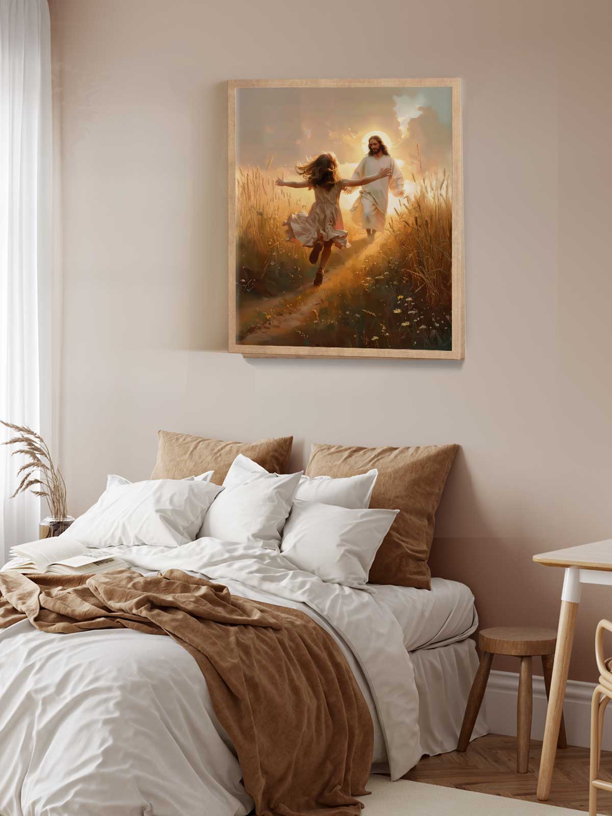 Full of energy and joy, this image shows a young girl running toward Christ, leaping into His embrace. A vivid reminder of safety in His love, it makes an inspiring artwork for nurseries, playrooms, or family spaces. A beautiful baptism or confirmation gift for young girls.
