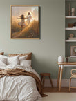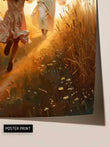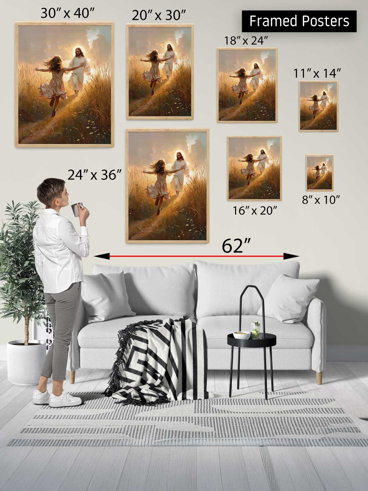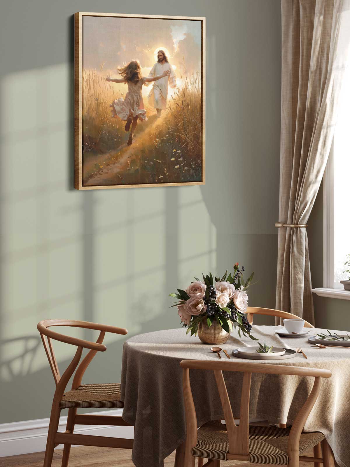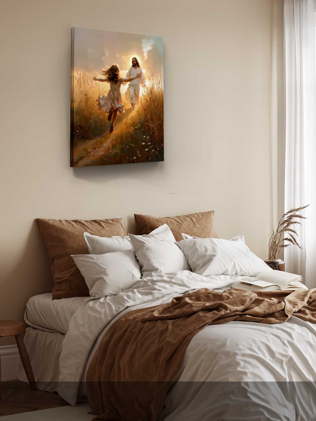 Full of energy and joy, this image shows a young girl running toward Christ, leaping into His embrace. A vivid reminder of safety in His love, it makes an inspiring artwork for nurseries, playrooms, or family spaces. A beautiful baptism or confirmation gift for young girls.
