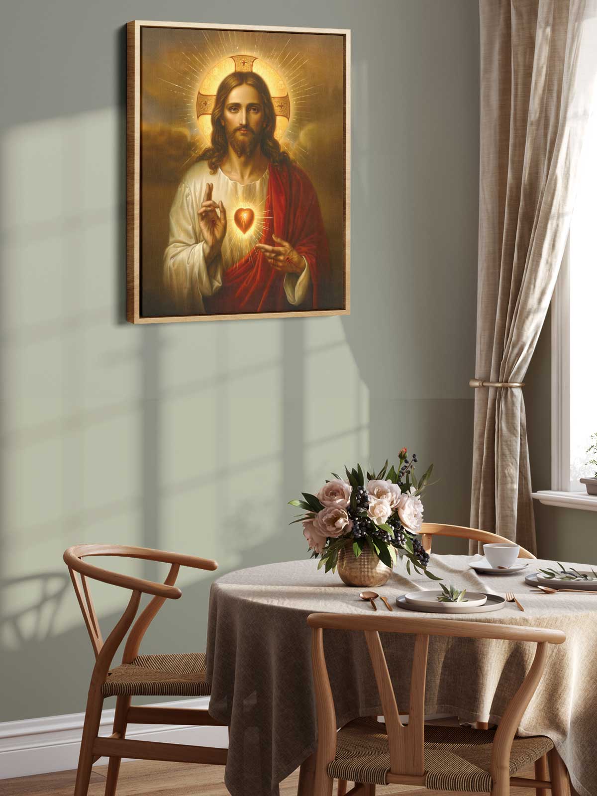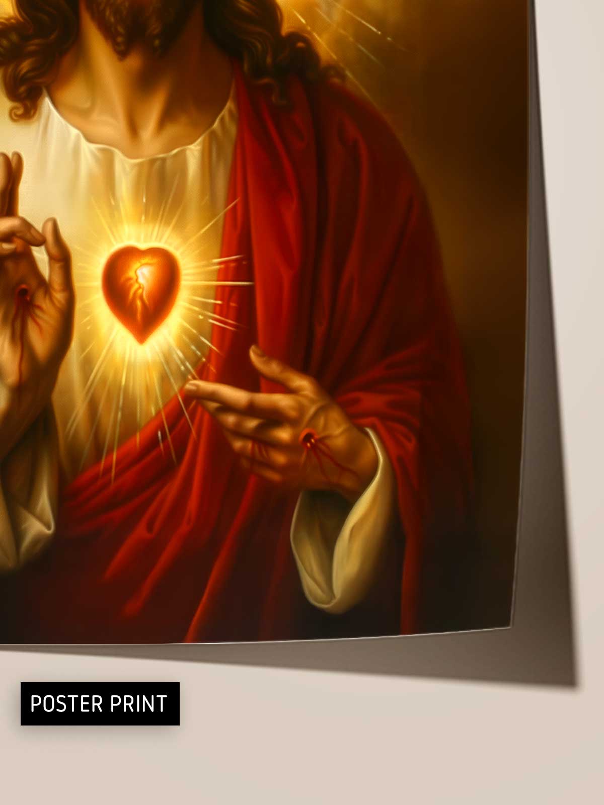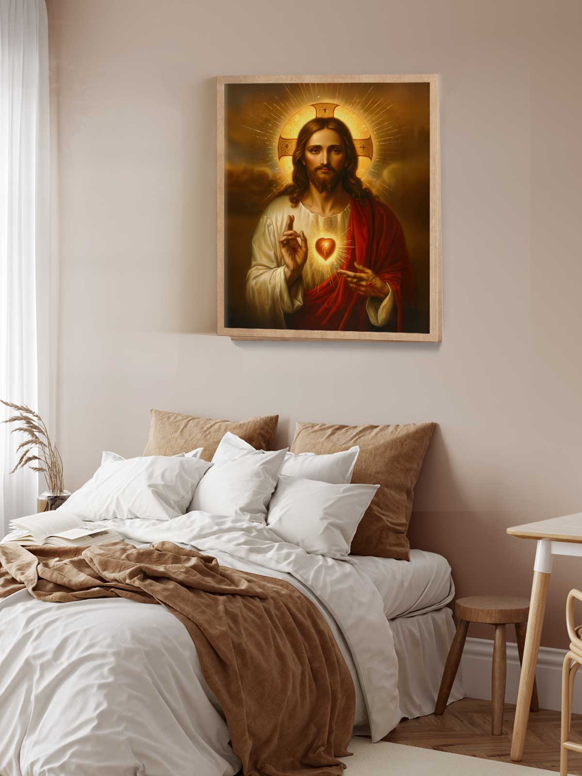 A timeless portrayal of the Sacred Heart, glowing with reverence and devotion. This classic depiction calls the faithful to prayer and reflection, making it an ideal centerpiece for any prayer room, church corner, or as a meaningful gift for First Communion, confirmations, or house blessings.