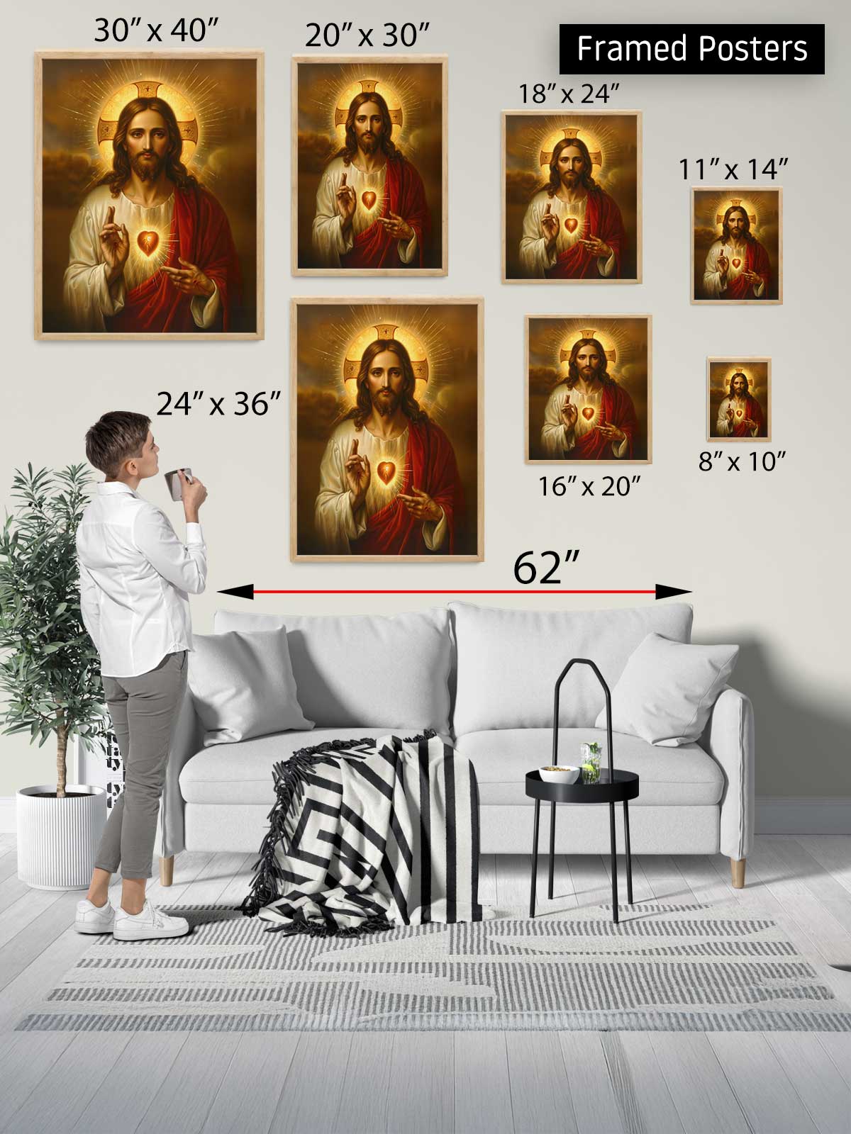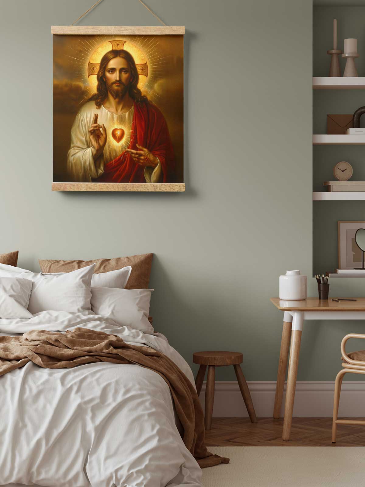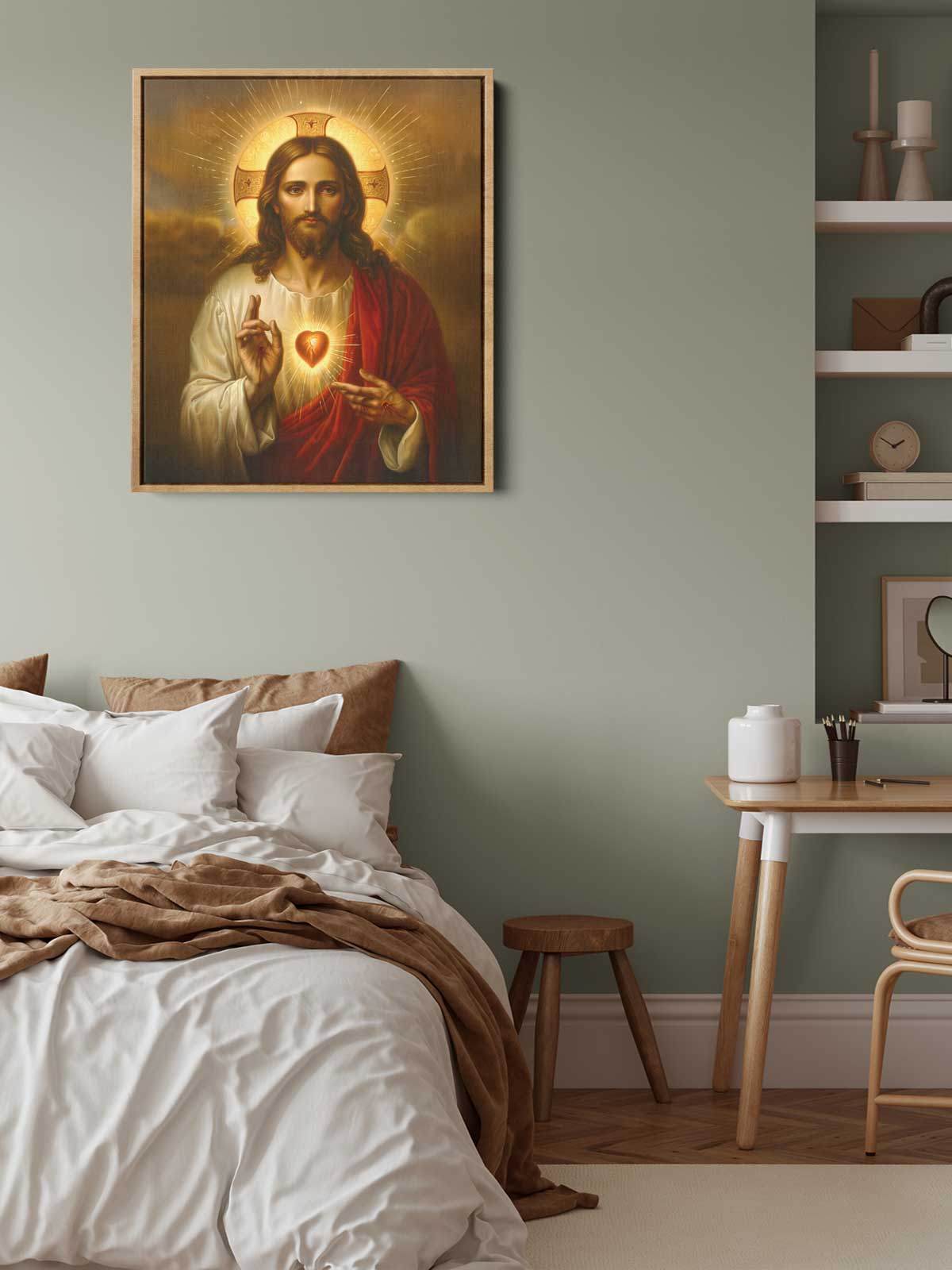 A timeless portrayal of the Sacred Heart, glowing with reverence and devotion. This classic depiction calls the faithful to prayer and reflection, making it an ideal centerpiece for any prayer room, church corner, or as a meaningful gift for First Communion, confirmations, or house blessings.