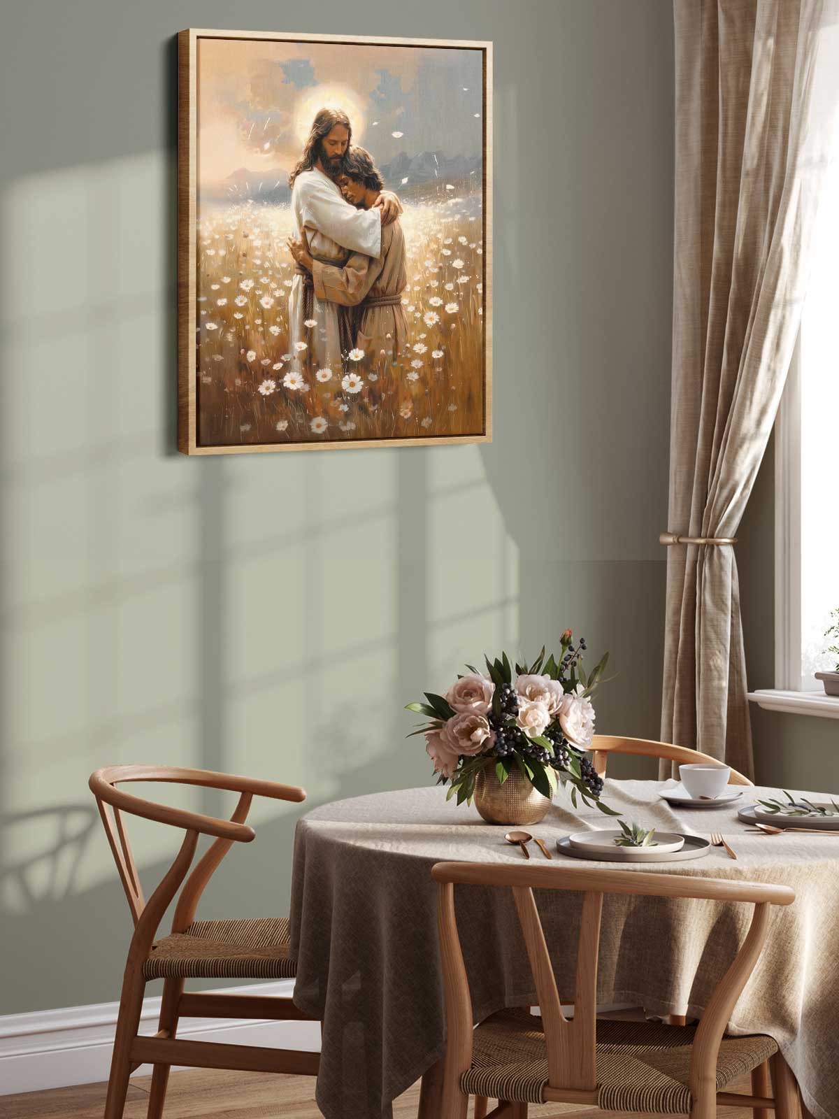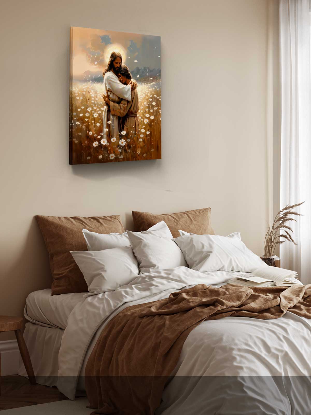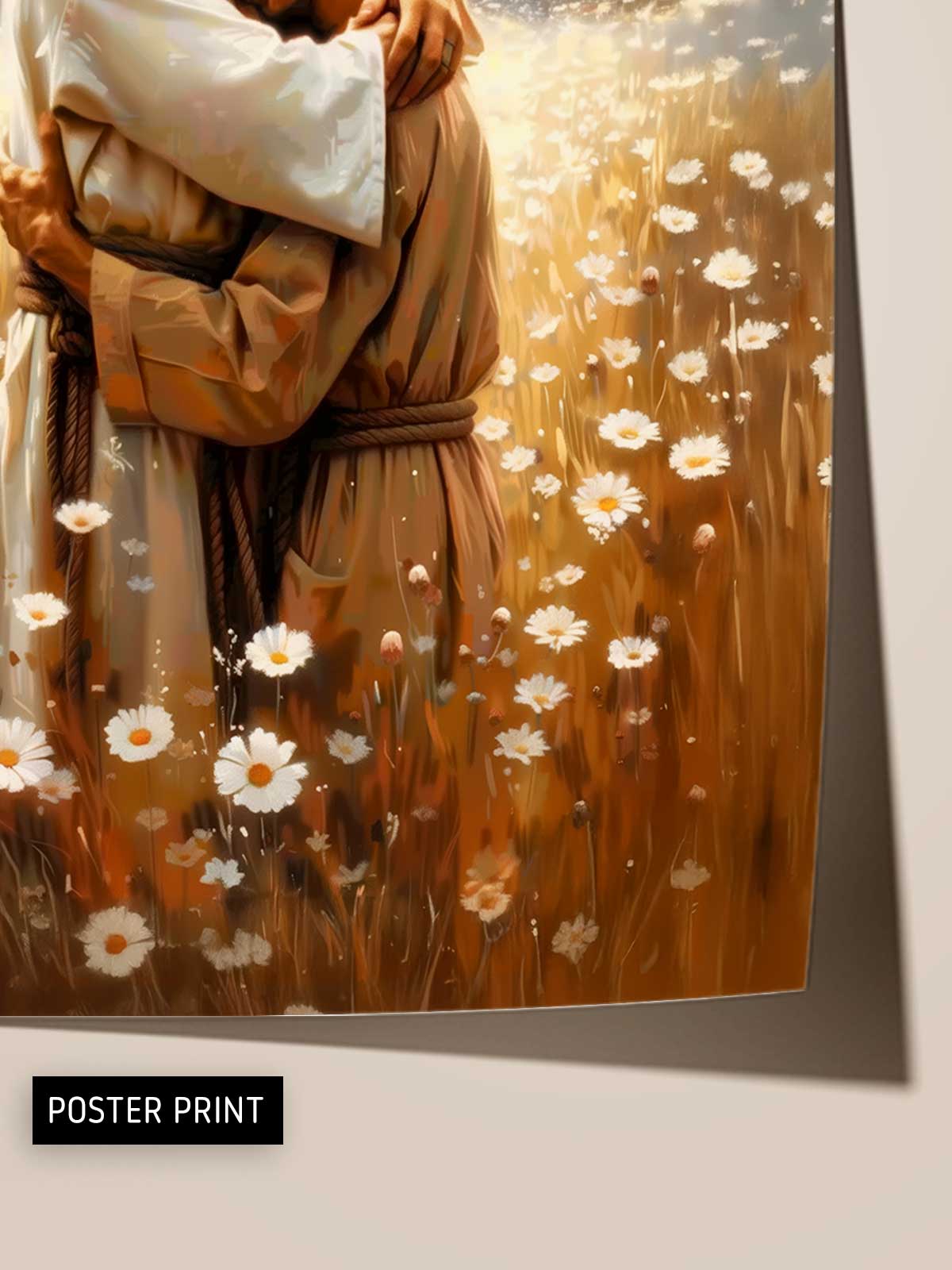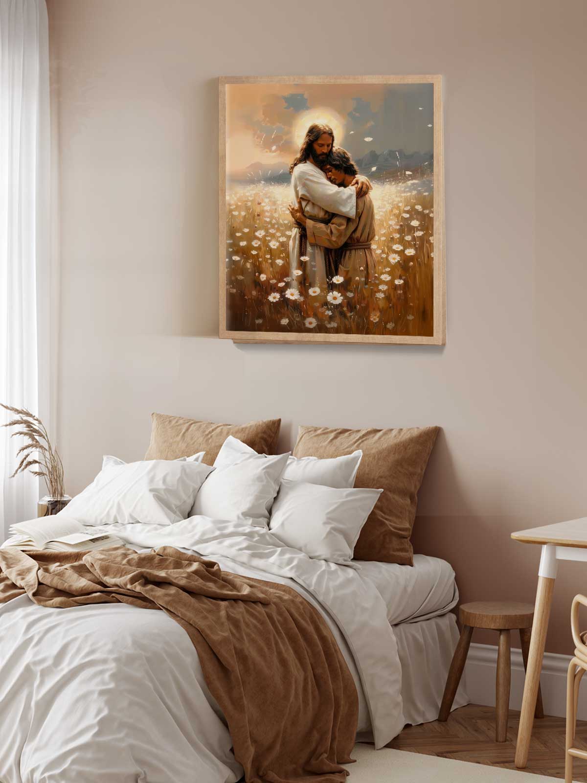 This artwork depicts Jesus guiding a young man with an embrace full of strength and encouragement. It reminds us that He stands with us through life’s challenges. A thoughtful gift for confirmations, graduations, or young men embarking on new paths.
