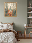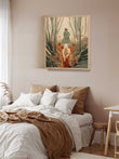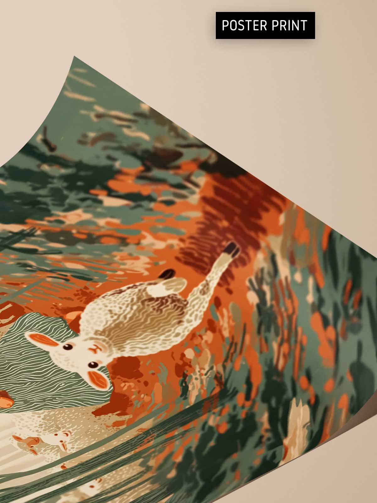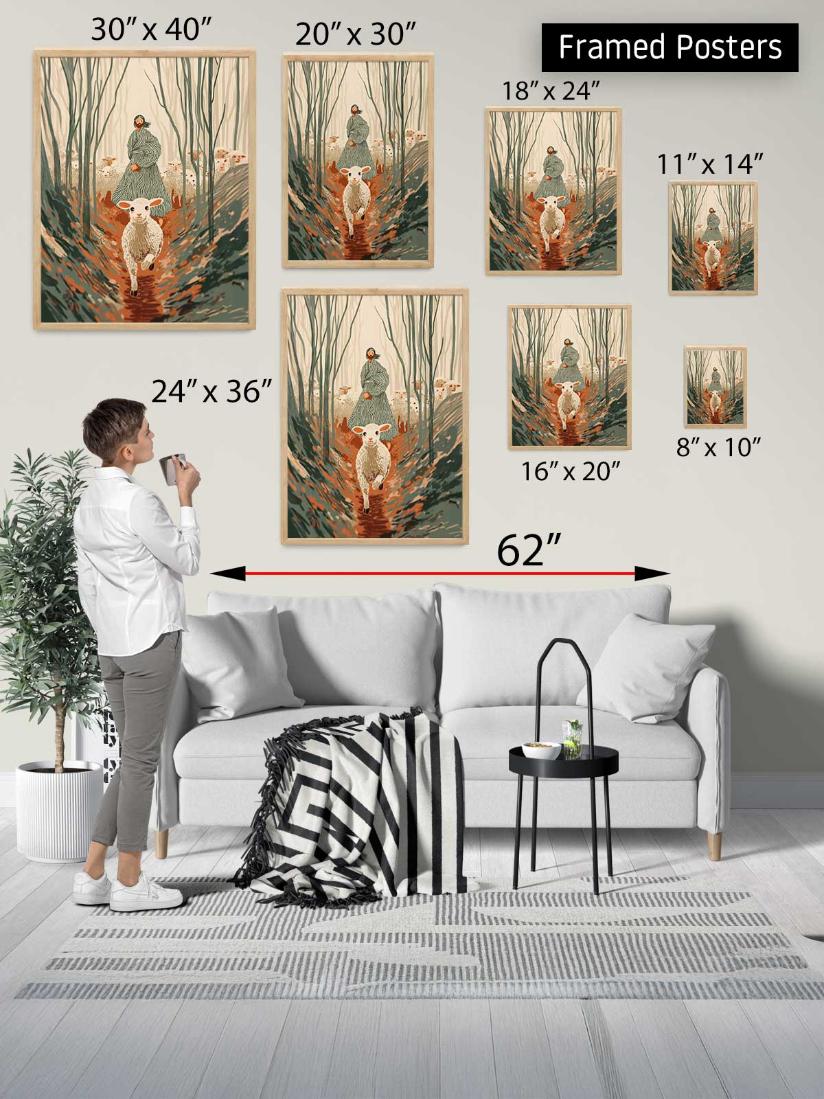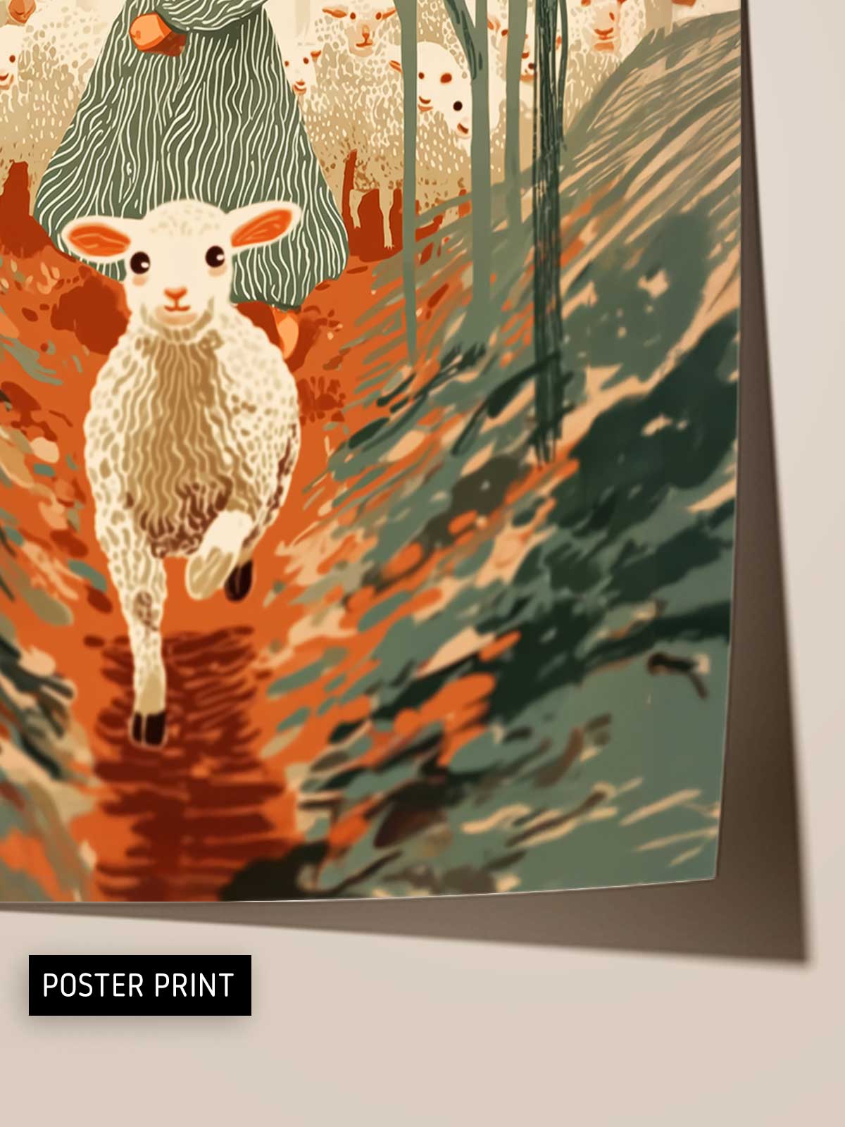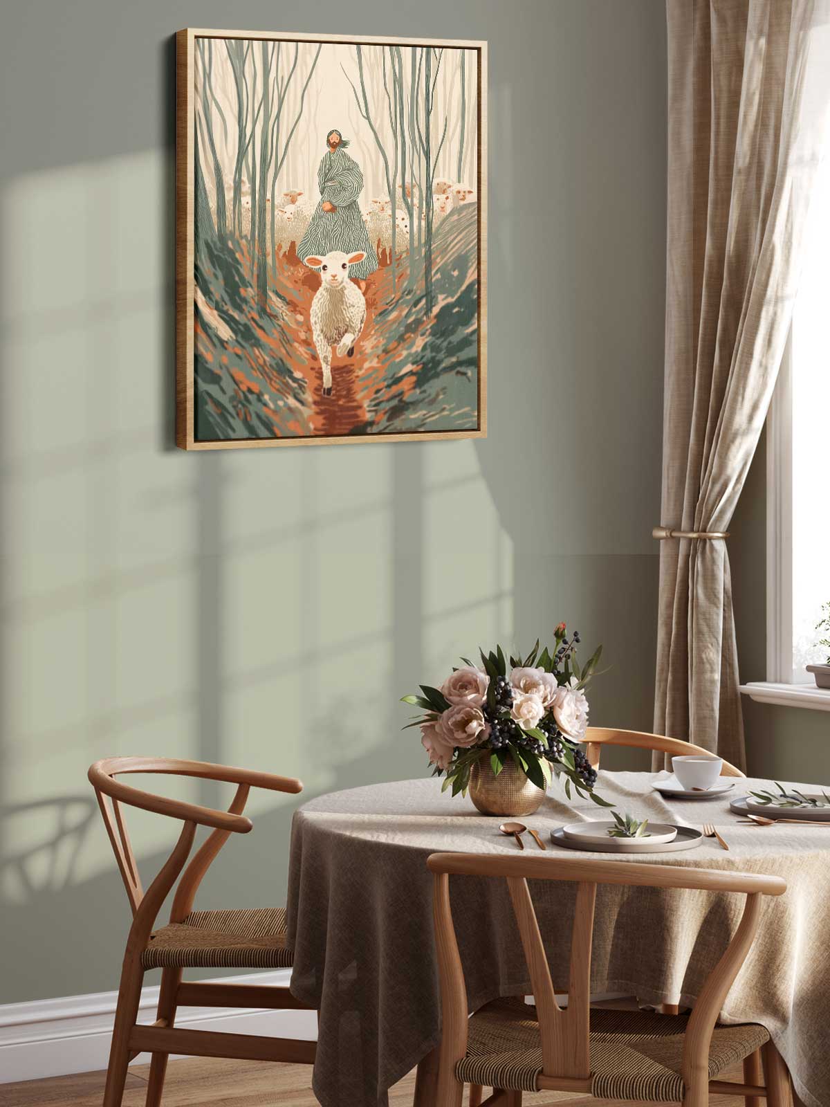 In a flat, modern illustration style, the Good Shepherd goes after the lost lamb with bold orange and green hues. Inspired by the parable of the 99, this piece blends sacred storytelling with contemporary design, making it a great fit for modern homes or as a unique confirmation gift.