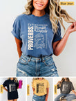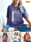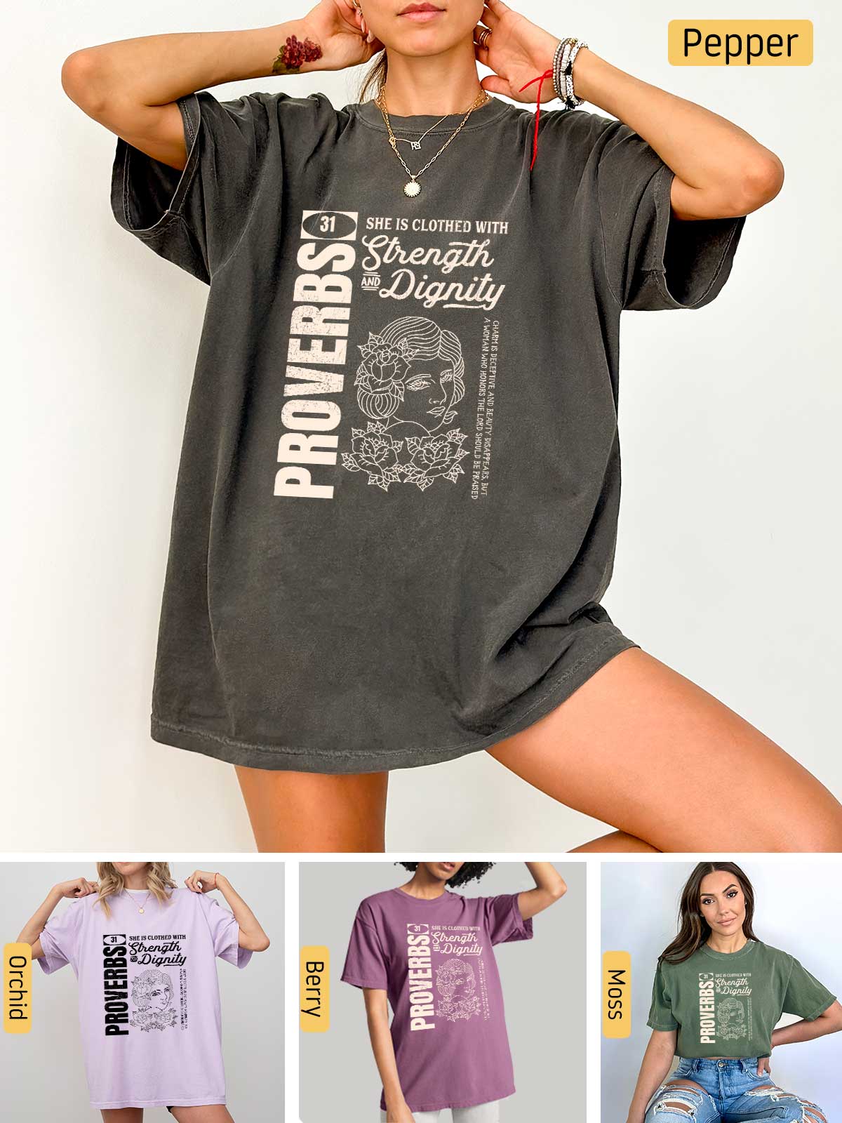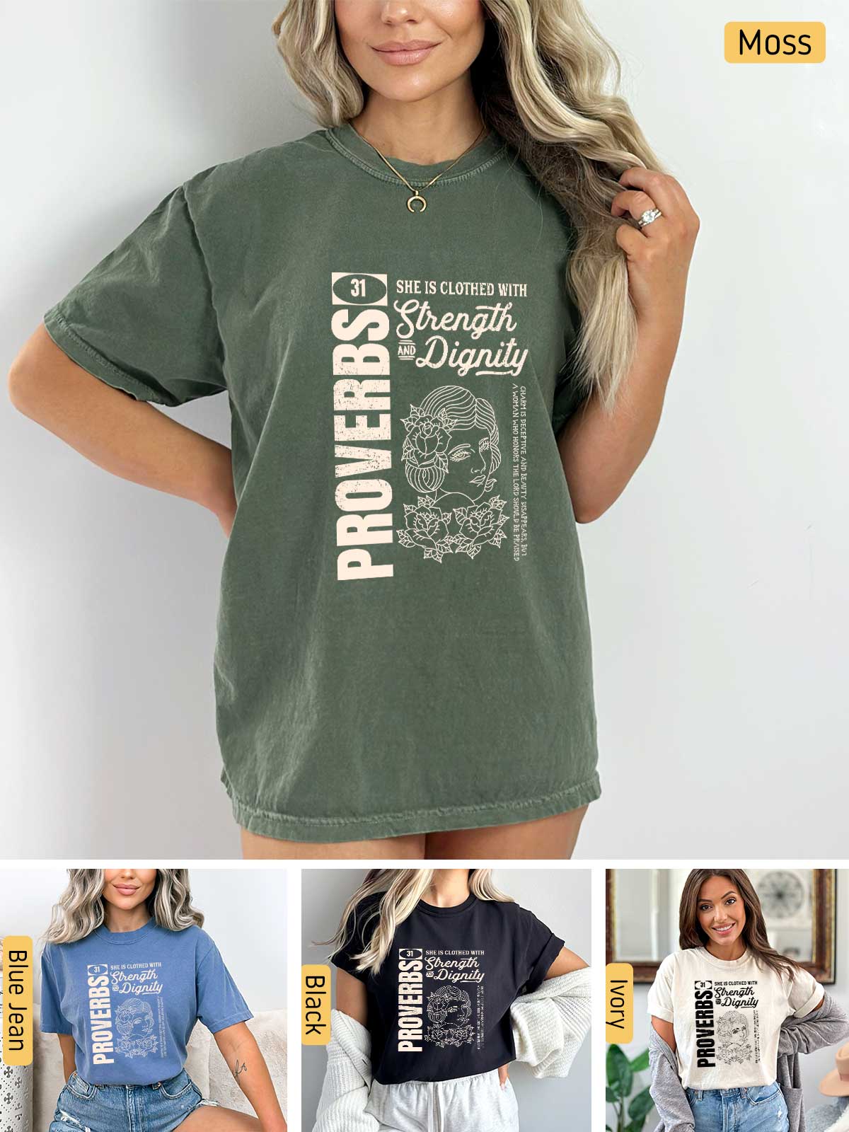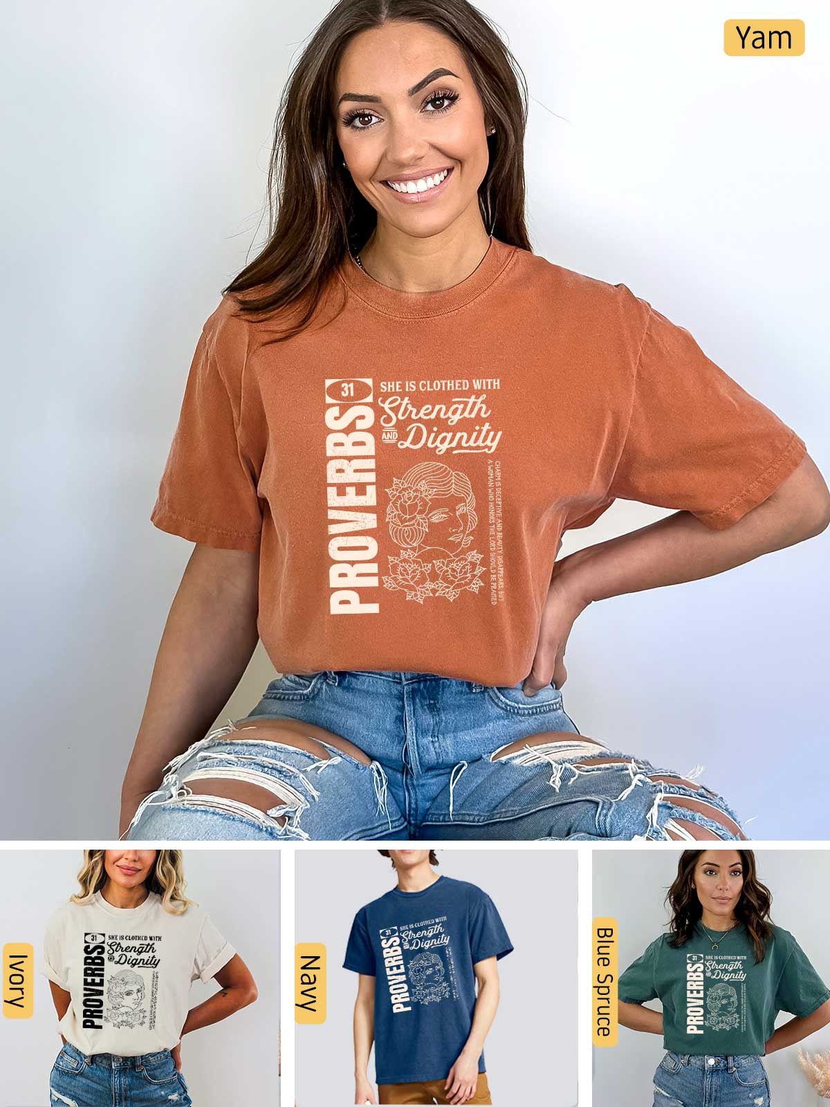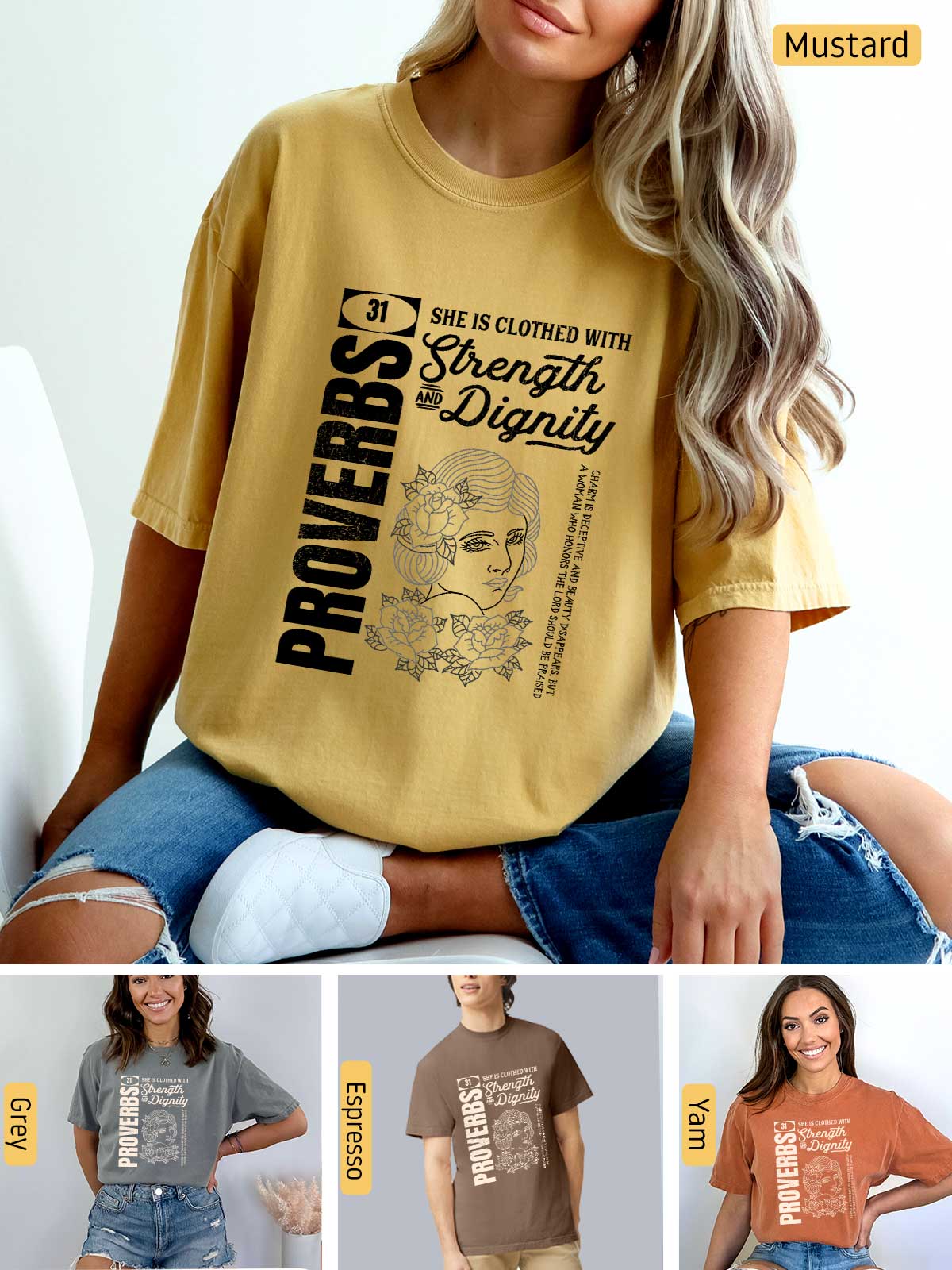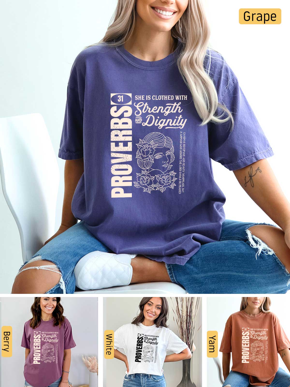 Adorn yourself with the beauty and strength of Proverbs 31. This apparel, featuring a graphic of a woman adorned with flowers on her head, carries the powerful message: "She is clothed in strength and dignity." Embrace the timeless wisdom and inner fortitude that this verse represents, and let it inspire you to walk with grace and confidence every day.