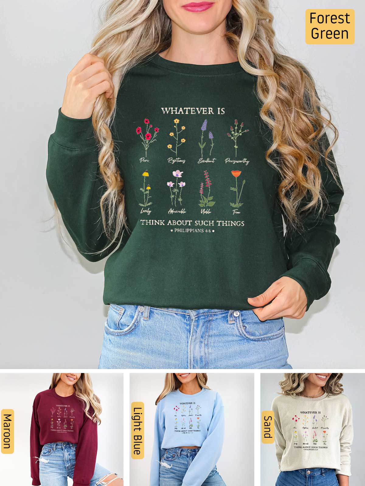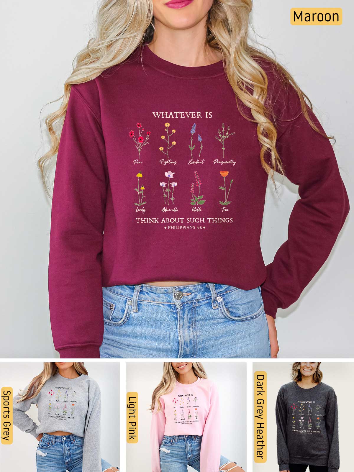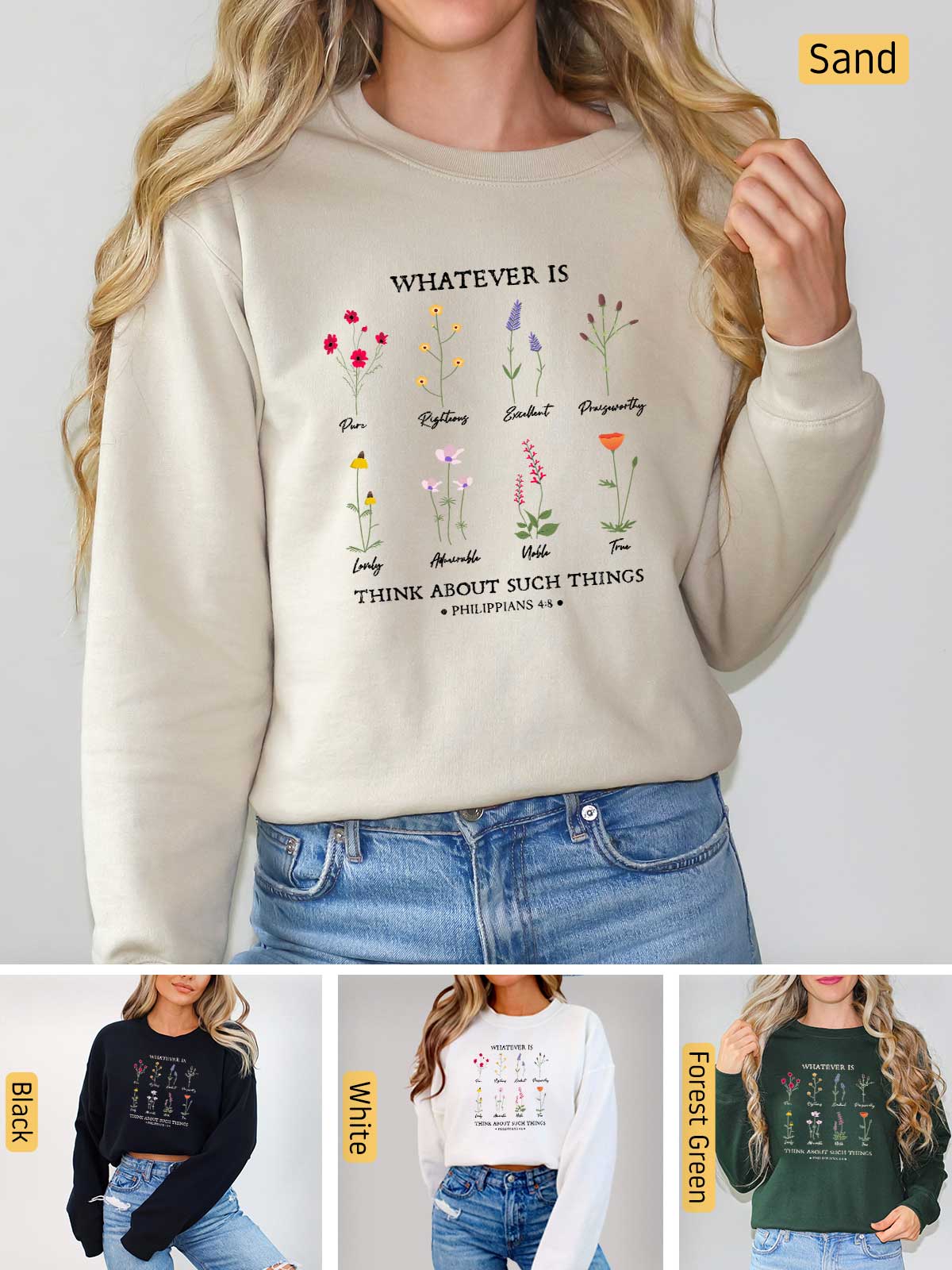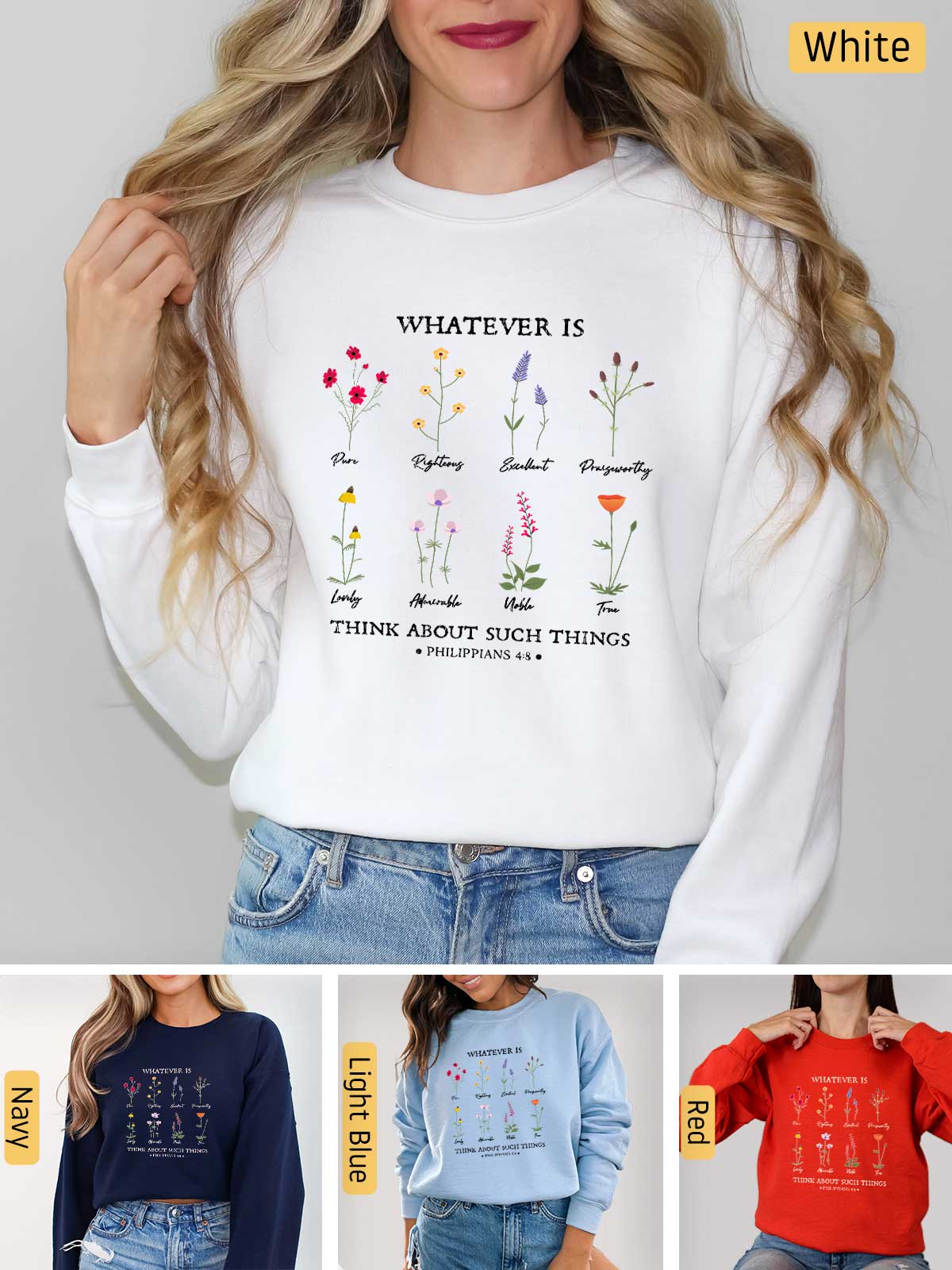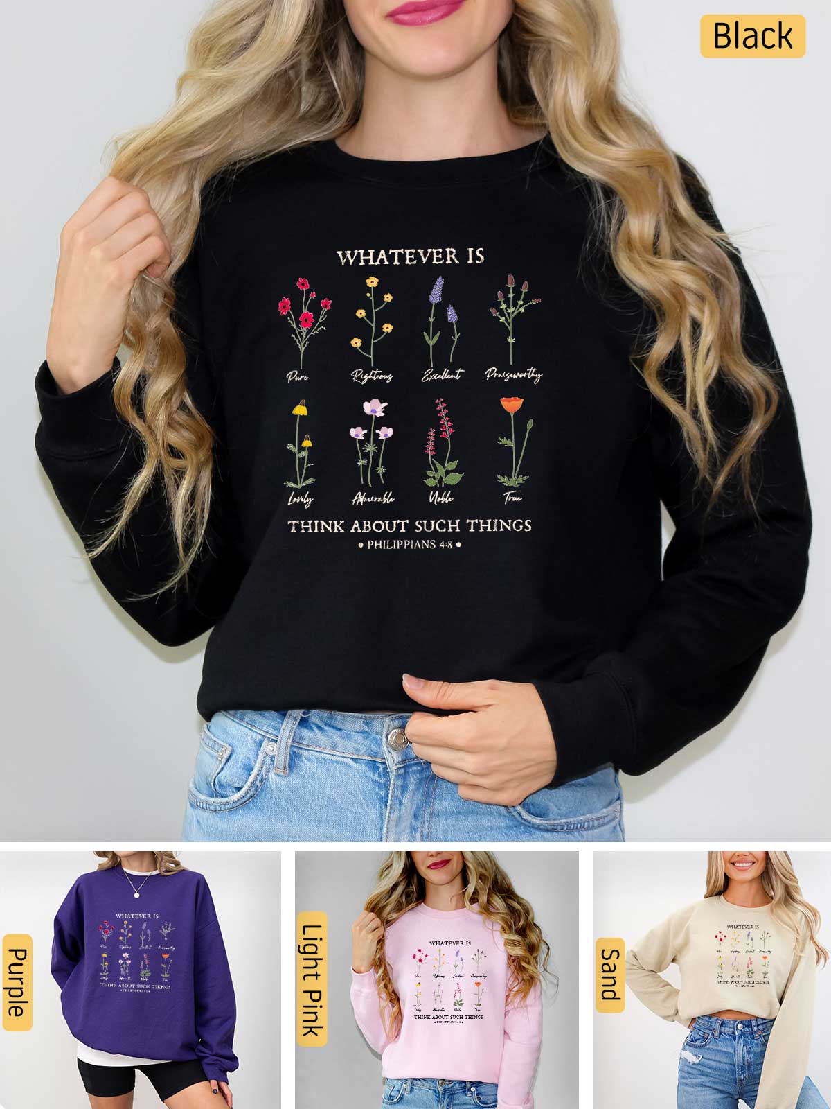 Celebrate the beauty of Philippians 4:8 with our enchanting apparel featuring a vibrant array of flowers, each symbolizing a character trait. This stunning design showcases the virtues of purity, righteousness, excellence, praiseworthiness, loveliness, admiration, nobility, and truth. Let this verse inspire you daily: "Whatever is pure, righteous, excellent, praiseworthy, lovely, admirable, noble, true...Think about these things." Adorn yourself with this meaningful message, and let these virtues bloom in your life, reminding you to focus on all that is good and worthy of praise. Embrace the power of positive thinking and wear your faith with grace and beauty.