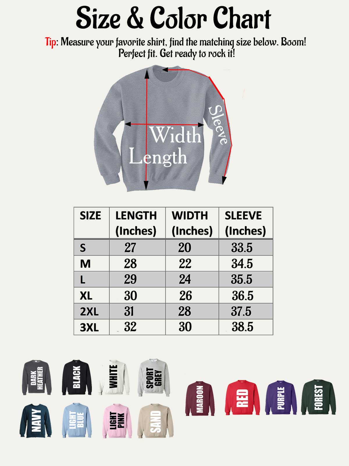• Tip: Measure your favorite sweatshirt and compare with size chart